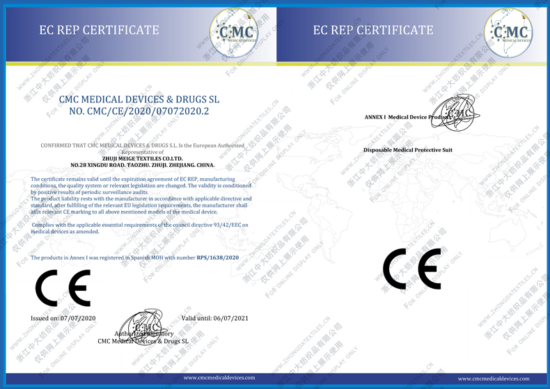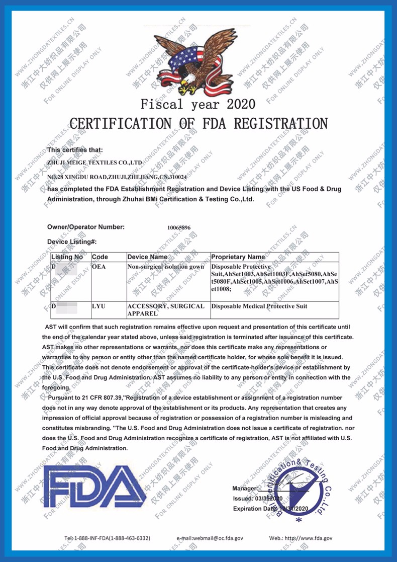 近日公司醫(yī)用一次性防護(hù)服取得了歐盟CE認(rèn)證證書(shū),美國(guó)FDA認(rèn)證,證書(shū)詳情見(jiàn)附件。
